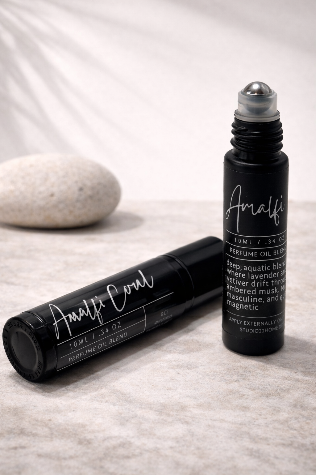 Amalfi Coral pulse point fragrance begins at the coast—clean marine notes layered with moss and earth. The scent feels fresh without sharpness, grounded without weight.